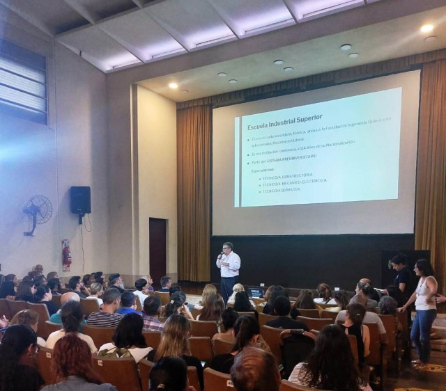 En el salón de actos de la Facultad de Ingeniería Química de la Universidad Nacional del Litoral, el Director de la Escuela Industrial Superior, TCH Carlos Lavanchy recibió a las familias ingresantes a primer año 2023. Junto al Equipo de Gestión, docentes de diferentes áreas, Equipo de Preceptores y Área de Apoyo Educativo, se dieron cita para informar sobre cuestiones académicas y de índole general necesarias para arrancar esta nueva etapa, que comenzará el próximo 13 de marzo.