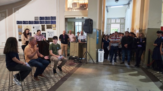 Antonio Mildenberger, excombatiente de la Guerra de Malvinas y Técnico Químico, de la promoción 1979 de la Escuela Industrial Superior, relató cómo fue la vuelta al país, de mano de preguntas realizadas por estudiantes.