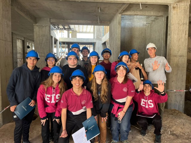 Los estudiantes de sexto año de la especialidad Construcciones "B" visitaron un edificio en construcción ubicado en Necochea 3561. Tuvieron la oportunidad de observar submuraciones, cimentaciones con vigas de vinculación y analizar detalles de proyectos, como rampas, cocheras, vigas invertidas y losas alivianadas, así como aspectos reglamentarios que incluyeron los roles profesionales detallados en el cartel de obra y cuestiones urbanísticas relevantes.