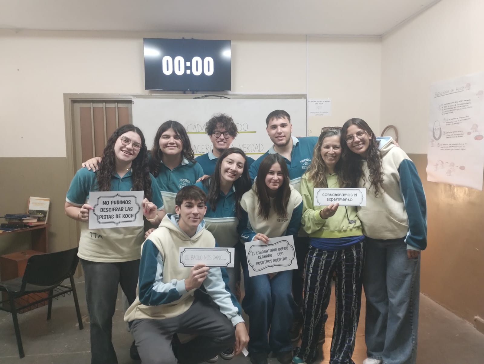 Más tarde, los estudiantes se enfrentaron al desafío de una sala de escape temática sobre microbiología, diseñada por alumnos de sexto año Química división "C" en conjunto con la docente Paula Giménez y la ayudante Melisa Puntillo. En esta propuesta lúdico-educativa, los participantes resolvieron distintos acertijos microbiológicos para avanzar en el juego, integrando conocimientos de forma dinámica, colaborativa y creativa.