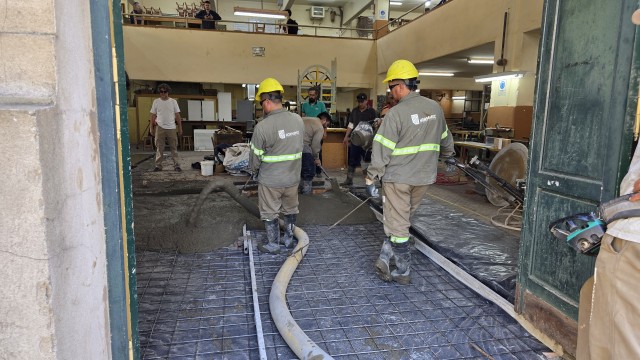 La obra incluyó la remoción completa de los tacos de madera, la nivelación y preparación de las superficies a intervenir, el posterior hormigonado y una terminación alisada tipo piso industrial. Gracias a esta intervención, el ingreso al taller puede realizarse ahora de manera segura y se habilita, además, la posibilidad de refuncionalizar uno de los sectores para el desarrollo de distintos trabajos propios del área de la carpintería.